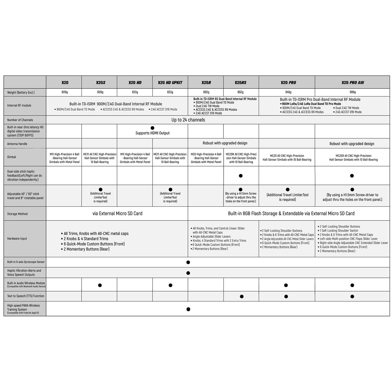 With solid performance based on the dual-band 900M/2.4G RF signal link with multiple operating combinations of RF modes, the TANDEM X20R & X20RS versions are equipped with the TD-ISRM RS built-in RF module which is capable of supporting multiple protocols (like TW, TD, etc).