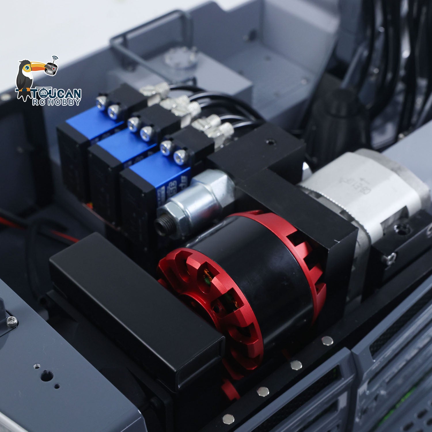 3. The hydraulic system uses a dual-pump hydraulic system, equipped with 2pcs 1.0L pumps, 2pcs 6354 sensor brushless motors, 2pcs 80A brushless ESCs, 6000-rpm cooling fans, visual oil filter accessories, etc. The bucket cylinder diameter of the boom and arm is 20MM, and the dual-pump hydraulic system can quickly inject hydraulic oil into this large-diameter cylinder. This dual-pump hydraulic system also uses a 6-way reversing valve with an overflow valve, among which 3 ways can be used with additional purchased upgrade parts. 6 quick-connect oil nozzles for upgraded accessories have been connected, and a manual quick release for the bucket is configured to facilitate players to replace different upgraded accessories.