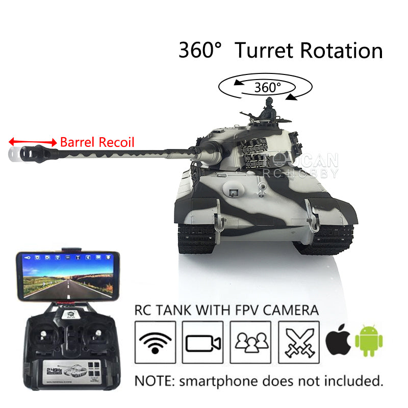Henglong 1/16 Radio Control Tank 7.0 King Tiger RC Tank 3888A w/ FPV Barrel Recoil 360Degrees Rotating Turret Metal Road Wheels Smoking