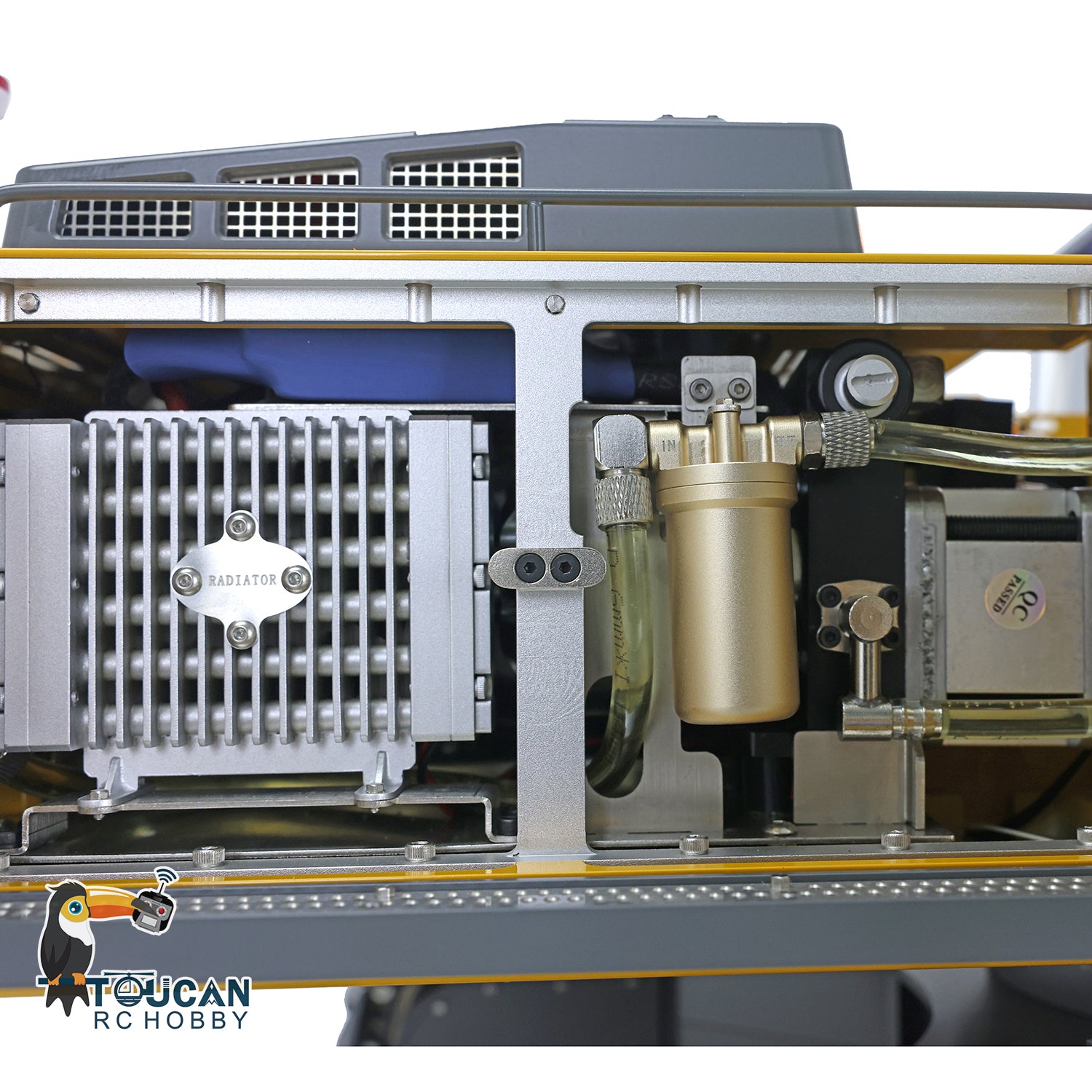 5. The excavator is equipped with a high-pressure oil pump with a working pressure of approximately 3.5Mpa (35kg) and a limit pressure of about 6-8Mpa. The pressure gauge allows you to check the pressure at any time. It also has a 6-channel directional valve with 6 servo pieces that correspond to specific actions: main arm, small arm, bucket, hydraulic quick replacement seat, and two spare channels (which can use upgrade parts such as a ripper or claw). Please note that this package does not include hydraulic oil, so you need to purchase it separately. It is recommended to use #32 or #46 hydraulic oil.