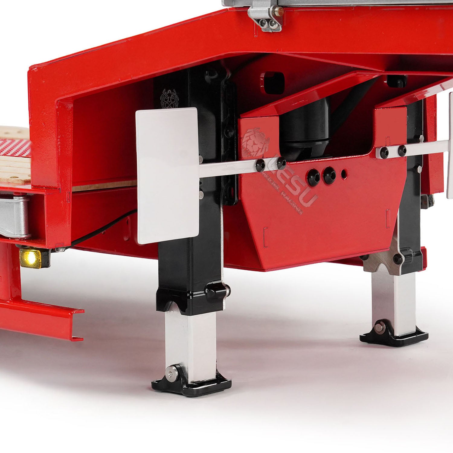 2. Features CNC-machined metal axles with 5-axle steering functionality. The metal wheel hubs are matched with high-quality rubber tires, and the axle suspension adopts simulated airbag suspension for enhanced realism.