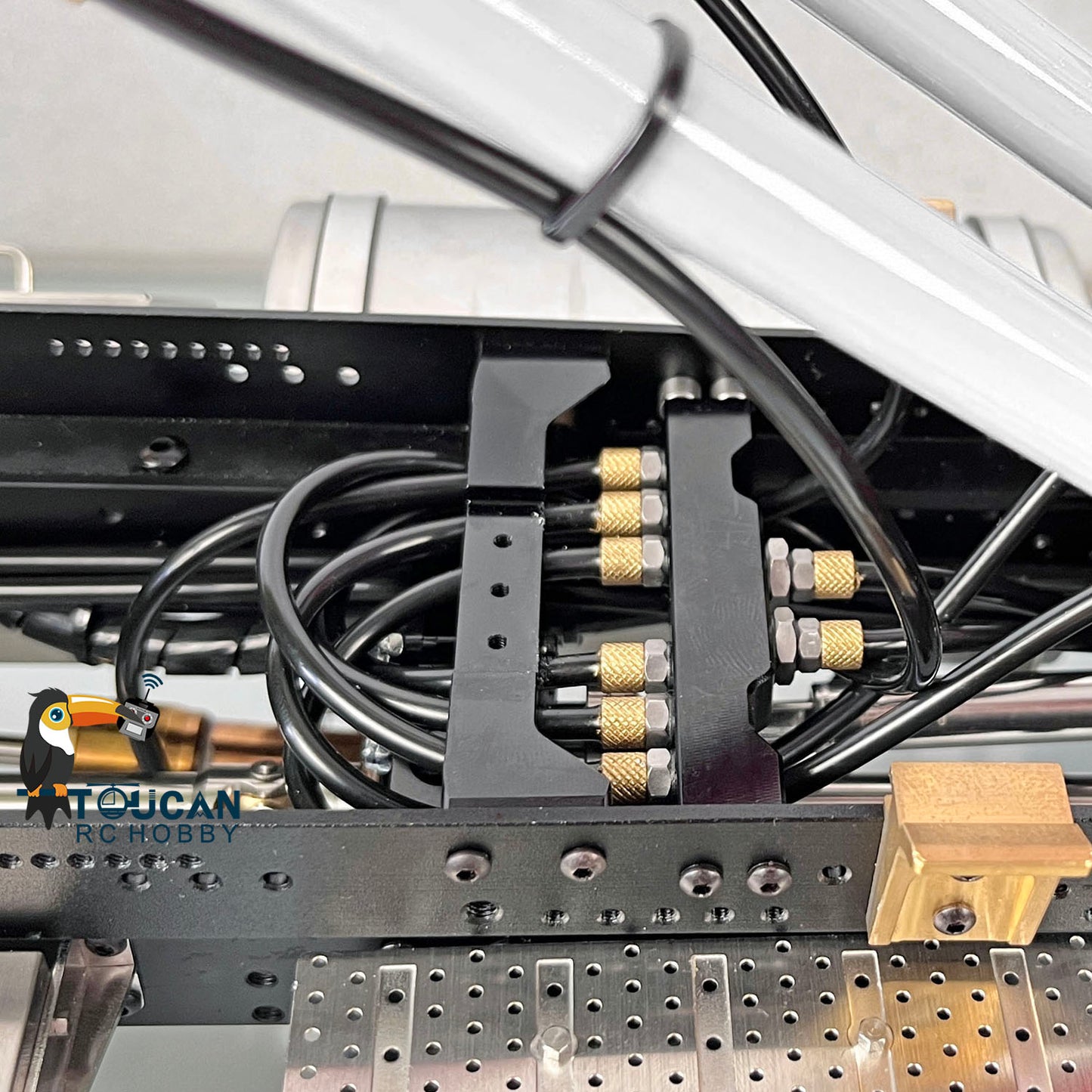 ?2, This hydraulic crane comes with lights, a hydraulic pump and ESC, a brushed rotary motor and ESC, and a 7-way reversing valve & relief valve. The full metal crane is more simulated and more refined and makes this truck more like a real truck. There are 7 pieces of 12G servos to control the 7-way reversing valve, the valve made of brass.