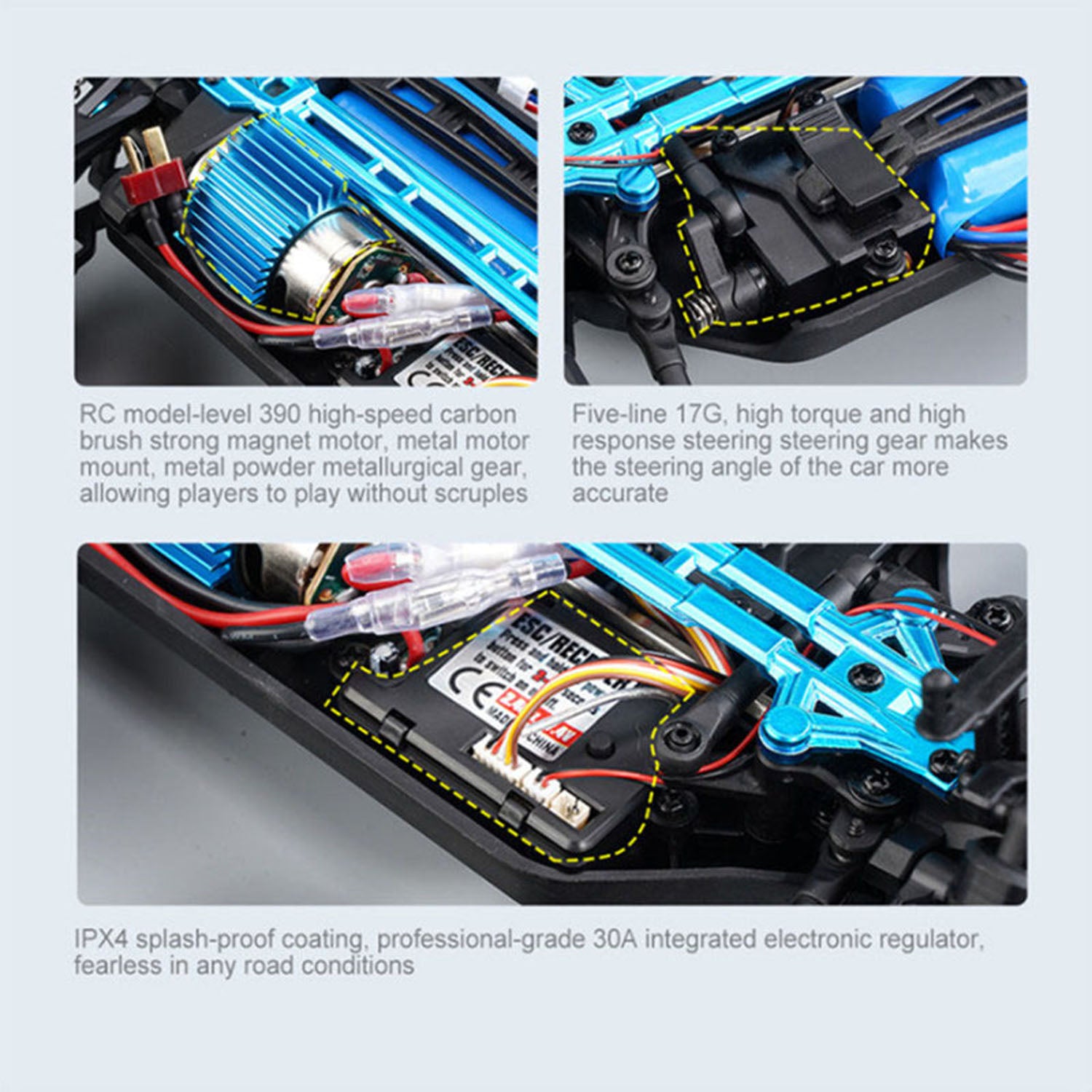 3, Integrated 2.4G 30A Splash-proof ESC: This all-in-one unit combines signal reception and control functions. It has a low voltage cut-off feature that automatically shuts down the vehicle when the battery voltage drops below 6.3 - 6.4V, preventing over-discharge. Additionally, it provides temperature control and motor stall protection, safeguarding the system from damage.