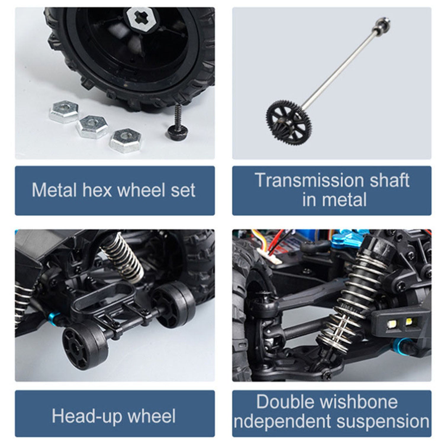 2, Robust Drivetrain Configuration: The front wheels feature universal joint driveshafts with cross-ball connectors, while the rear uses split dog bone driveshafts, streamlining maintenance and replacement. Fitted with 16 ball bearings, front/rear metal arm mounts, and a metal center drive shaft, the vehicle ensures smooth power transmission, minimizes mechanical failures, and boosts performance longevity.
