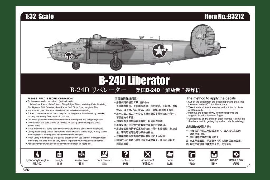 US Stock Hobbyboss 83212 1/32 US B-24D RC Bomber Aircraft Radio Controlled Plastic Airplane Liberator Unpainted Unassmebled