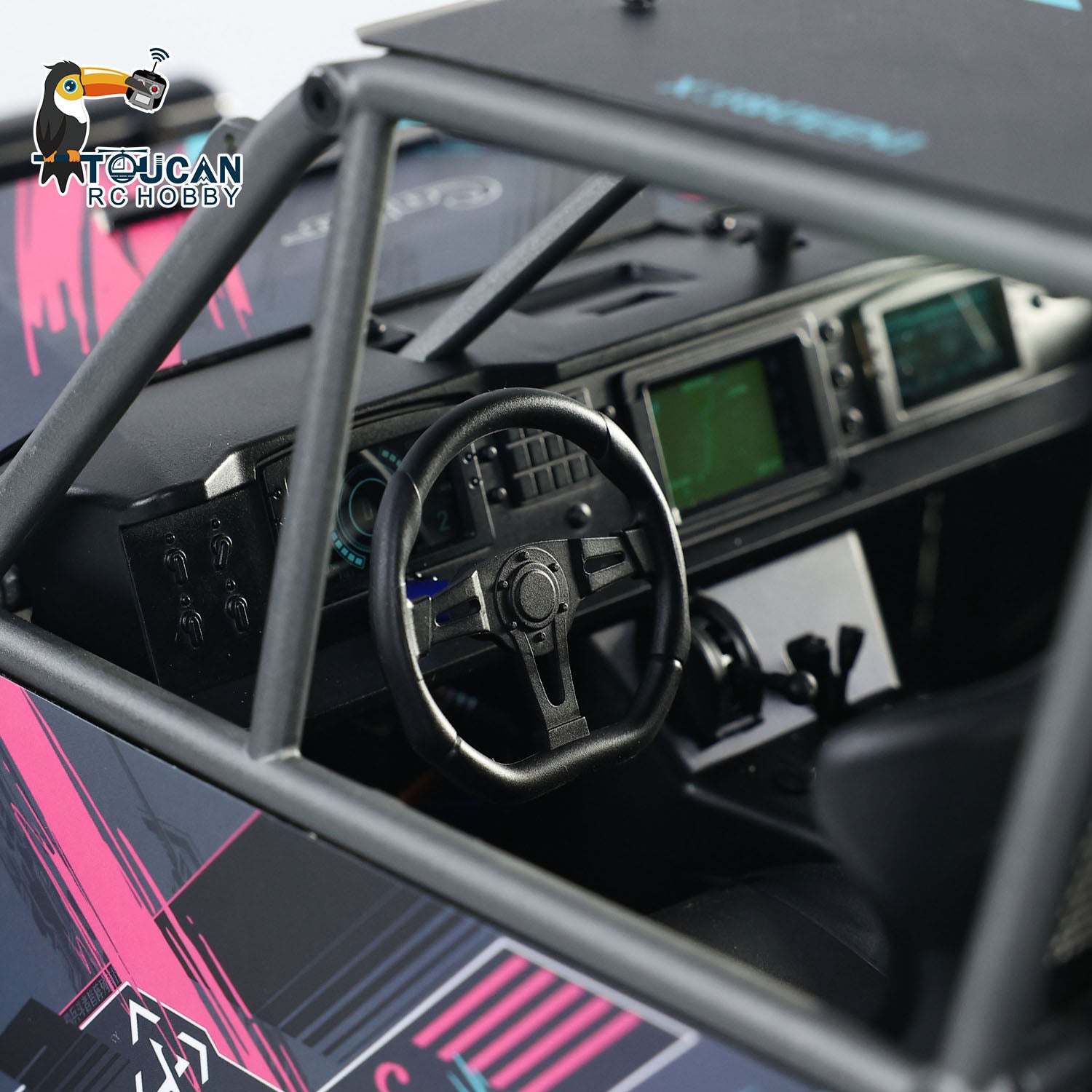 ???- Features a faithfully replicated central console dashboard, racing bucket seats, and a steering wheel that can be linked to electronic control for rotation.